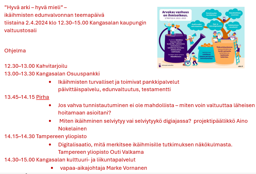 Tilaisuuteen ennakkoilmoittautuminen 90 ensiksi ilmoittautunutta mahtuu mukaan. Ilmoittautua voi Merjalle puh. 050 368 4735.